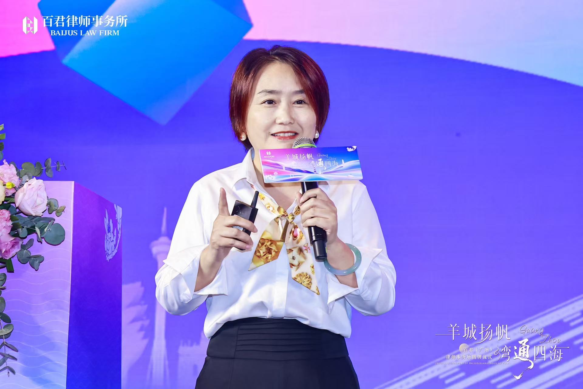 广东省西南政法大学校友会会长、广东省律师协会名誉会长、广州金鹏律师事务所创始人王波在致辞中衷心祝贺百君广州所开业。他表示,百君从西部走向全国,短时间内在北上广相继落子,展现出百君所的非凡魄力与战略眼光。广州是一个创业的好地方,期待百君人在怀抱远大理想的同时,秉持执着的精神,在大湾区无惧风雨,扬帆远航,创造出西部律师在大湾区的灿烂篇章。