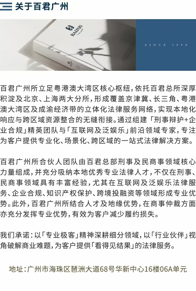 百君广州所的成立,不仅是百君深耕大湾区的重要一步,更是百君规模化发展战略的关键落子。这一举措将有效整合大湾区优质资源,提升区域协同服务能力,充分发挥整体优势,为客户提供更加专业、高效的一站式法律服务解决方案。从西南到华南,从区域布局到全国发展,百君在保持专业竞争力的同时,不断拓展法律服务的深度与广度。